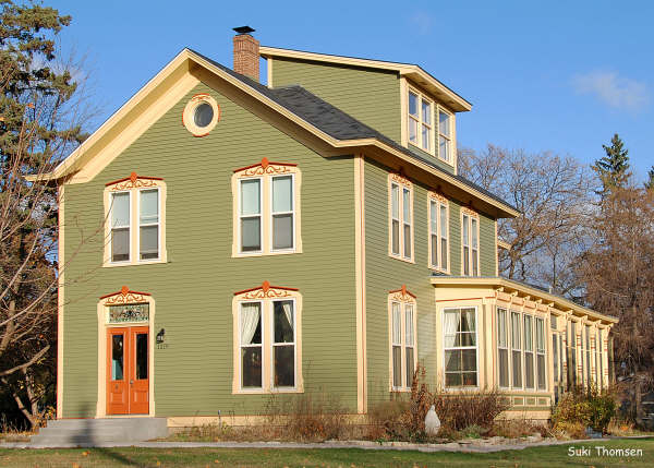 The house is a good example of the Italianate style characterized by the double front doors, the round window in the gable, the decorative crowns over the paired windows, the transom over the front door, and the projecting window bay on the south side. At some time in the past, there were almost certainly brackets under the eaves.