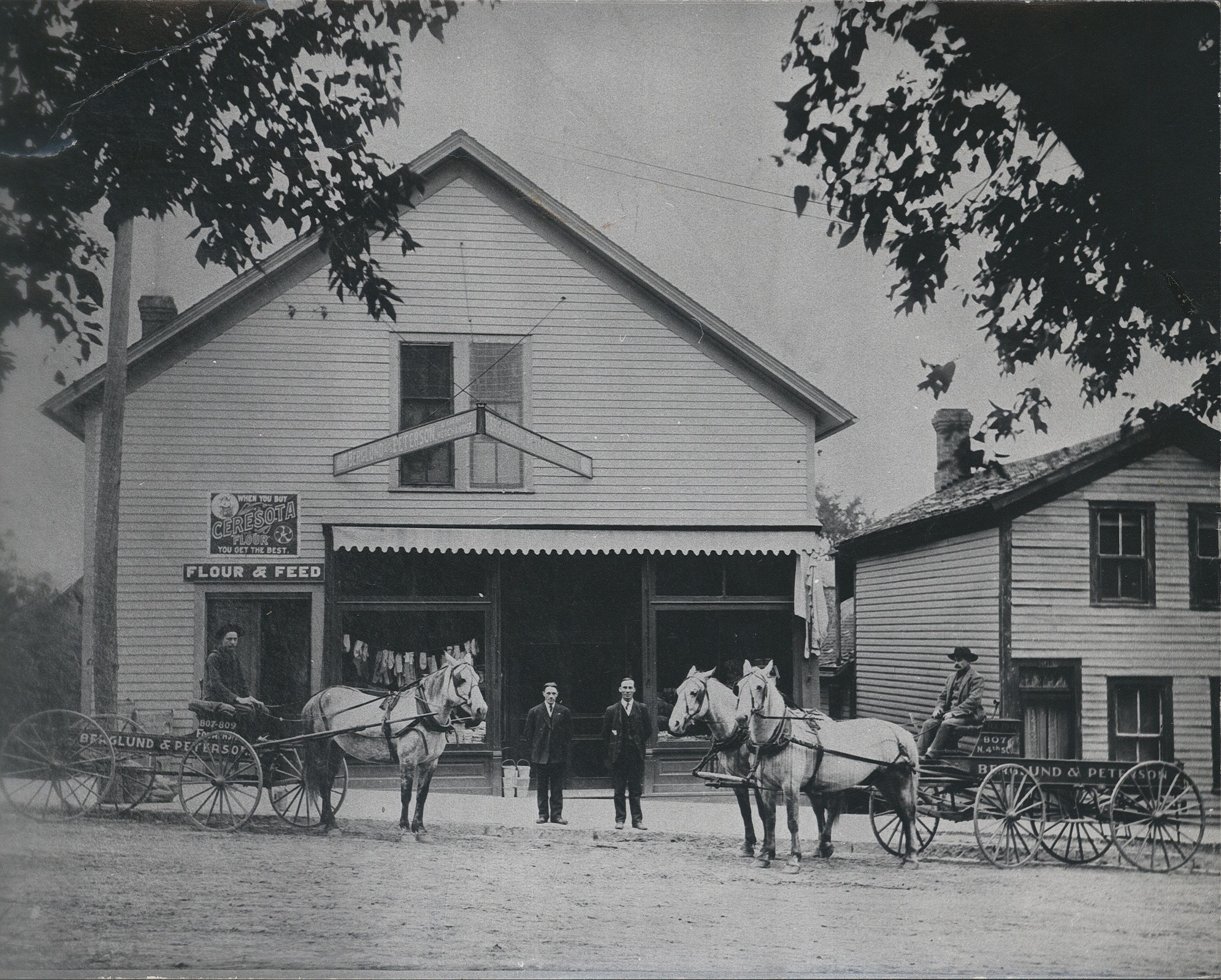 In 1904, the Swedish Mission Church at 807 North Fourth Street was sold by the Congregation in order to build a new larger church at 320 North Fourth Street. This original church building, built in 1882, was converted in 1905 from a church to a neighborhood grocery, hardware, and feed store known for the first twenty years of its life as the Berglund & Peterson store. Carl Berglund lived nearby at 702 North Fourth Street, and Carl E. Peterson lived at 318 W. Hickory Street. Their first store had been across the street at 804 North Fourth Street.