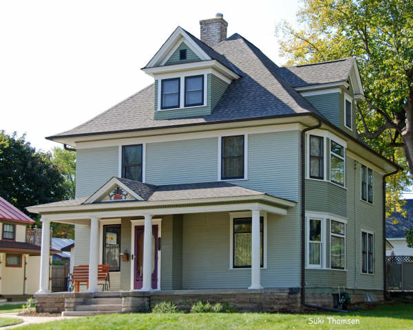 This handsome example of an American Foursquare was built in 1906. The two-and-a-half-story, frame house has a limestone foundation, clapboard siding, one-over-one double-hung windows, and a steeply pitched hip roof. American Foursquare refers to the nearly cube-like form of the house. They typically has a simple box shape, were two or two-and-a-half stories in height, with a four-room floor plan, which was popular in the United States from the late nineteenth to early twentieth centuries. While many were built with a low-hipped roof with deep overhang, a large central dormer and a full-width porch with wide stairs, most foursquare forms borrowed details from other styles, including Prairie, Craftsman, Classical, or even Victorian detailing. This house has all of the typical Foursquare characteristics except that it features a steeply-pitched hipped roof with flared eaves which reflects the influence of the then waning Queen Anne style. The house also features bay windows on the north and south elevations and a pedimented dormer on the front elevation.
